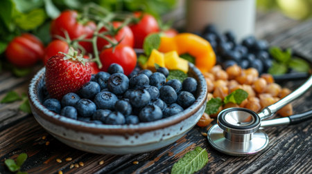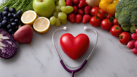 Explore the vibrant relationship between heart health and nutrition with this visually striking image featuring fresh produce and a stethoscope.