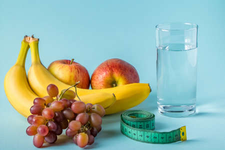 Fruit, glass of water and measuring tape on a blue background. The concept of diet and proper nutrition. Place for text.