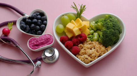 A vibrant heart-shaped bowl filled with fresh fruits and vegetables, accompanied by a stethoscope on a pink background, symbolizing healthy eating and wellness.