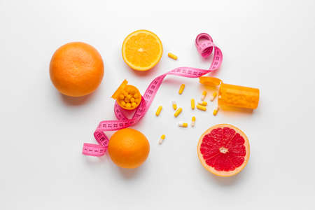 Bottles with weight loss pills, citrus fruits and measuring tape on white background