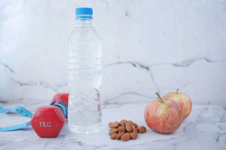 fresh drinking water, apple and a pink color dumbbell on table