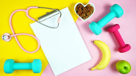 Healthy lifestyle prescription for good health concept flatlay with stethoscope, healthy food, and exercise equipment on modern pastel background.