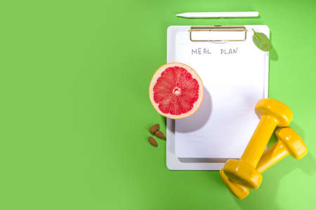 Meal diet plan concept, with in notepad, healthy food fruits, vegetables, tablet, notebooks and accessories for sliming on bright green table background