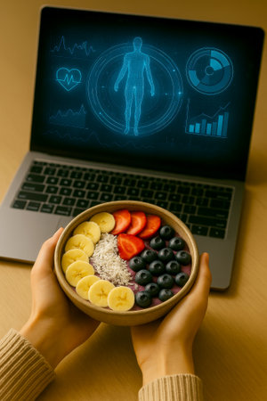AI-generated image of a person holding a healthy smoothie bowl with banana, strawberries, blueberries, and rice in front of a laptop displaying futuristic health analytics.