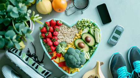 Vibrant array of healthy snacks encased in a heart-shaped dish, set against workout gear and a hydration bottle, inspiring wellness and vitality