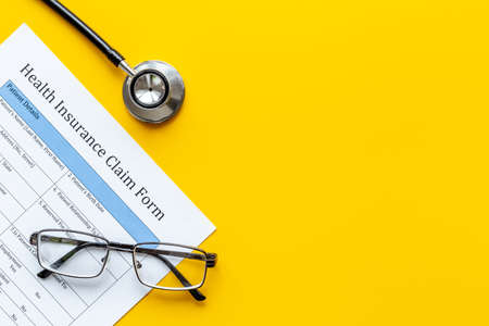 Health insuranse claim form, top view. Medical care concept.