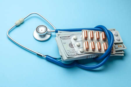 Stack of cash dollars and pills in blister with stethoscope on a blue background. The concept of medical strechevka or expensive medicine, doctors salary