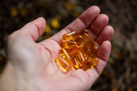 Handful of omega 3 capsules in palm of hand