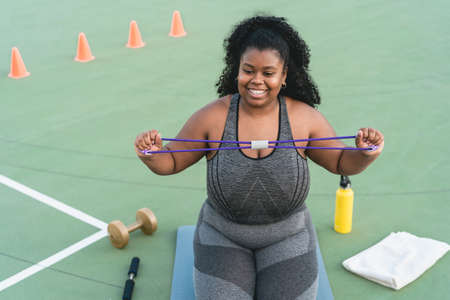 Curvy Afro woman doing workout exercises session - Young African female having fun training outdoor - Sporty people lifestyle concept