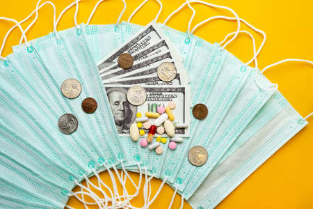 Sale of medical masks. Protective medical mask and different types of pills next to money on yellow background. Coronavirus concept. 2019 nCoV.