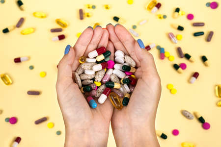 Many multi-colored pills in the hands of a woman against the background of scattered capsules. Supplemental and healthcare product, top view.