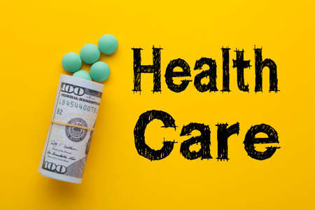 The word health care with medical pills with rolled 100 dollar banknotes on a yellow background.