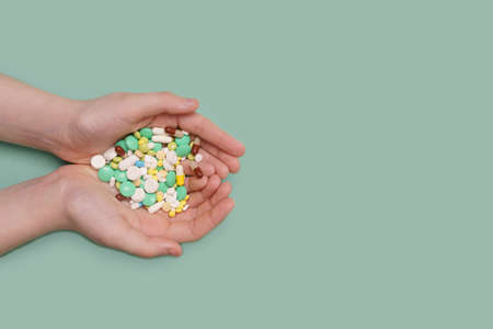 Child hands holding a lot of different pills and capsule. Healthy, medical concept.
