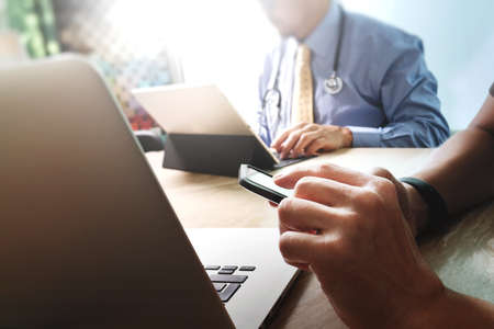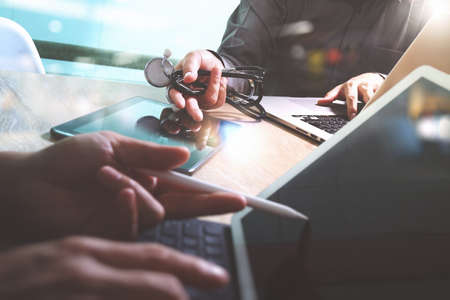 Medical technology network team meeting concept. Doctor hand working smart phone modern digital tablet laptop computer, sun flare effect photo