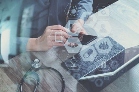 medical doctor hand working with smart phone,digital tablet computer,stethoscope eyeglass,on wooden desk,virtual graphic interface icons screen