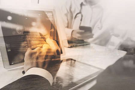 Double exposure of Medical technology concept. Doctor working with smart phone and stethoscope and digital tablet computer in modern office at hospital with London city