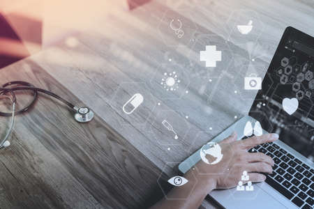 Medical technology concept,smart doctor hand working with modern laptop computer in modern office with virtual icon diagram