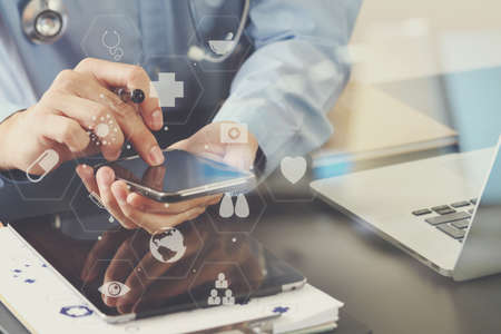 smart medical doctor working with smart phone and stethoscope and laptop and digital tablet computer on dark wooden desk with virtual icon diagram