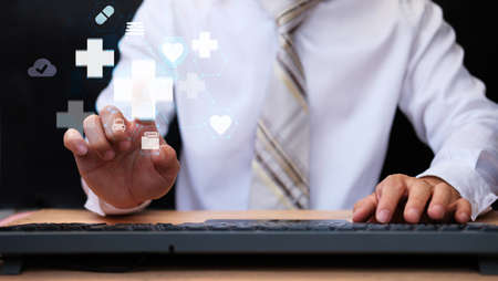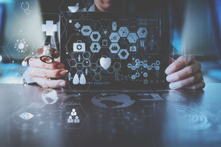 Medical technology concept,smart doctor hand working with modern computer in hospital office with virtual icon diagram