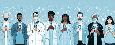 A diverse group of individuals, including men and women, wearing lab coats and casual attire, holding smartphones. The background features digital icons symbolizing technology.