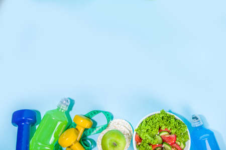Sport healthy lifestyle, diet concept. Slimming weight loss fitness background with measuring tape, colored dumbbells, salad, cereal crisp bread, sports water bottle on Blue background copy space