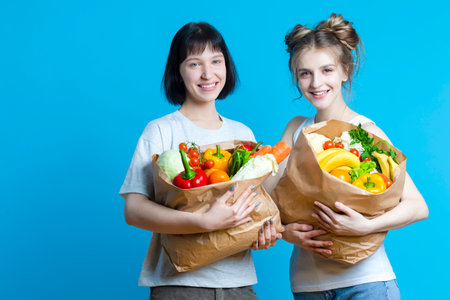 Healthy Lifestyle Ideas. Two Smiling Caucasian Girlfriends Posing With Paper Bag Filled Grocery And Vegetables Posing Over Pure Blue Background. Horizontal Image Composition