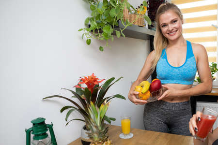 An athletic girl holds a fruit basket at her hip. A dose of energy before a workout.