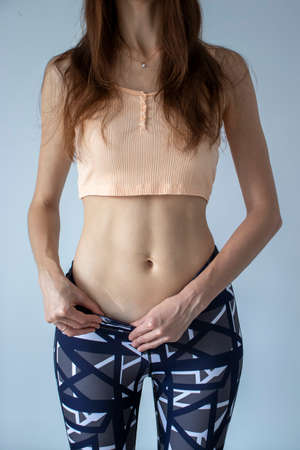 Close-up photo. a slender girl in sportswear shows a tight figure and a tummy.