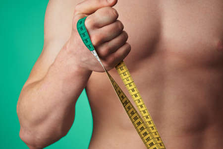 torso of a man, measuring tape in a hand, close-up.