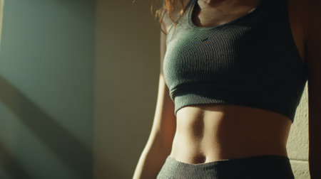 Fit woman showing abs while posing under sunlight in gym