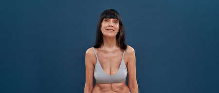 Feeling young at any age. Beautiful middle aged caucasian woman with age wrinkles around eyes posing on dark blue background, panoramic banner with copy space for text