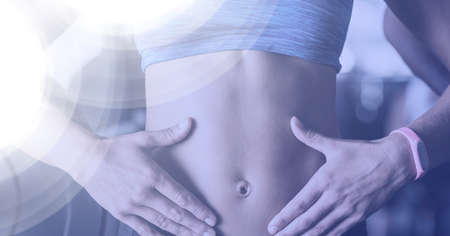 Composition of midsection of women in grey fitness top with spot lights. sport, fitness and active lifestyle concept digitally generated image.