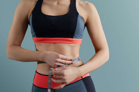 Woman in sportswear measuring her waist on blue background. Healthy lifestyle