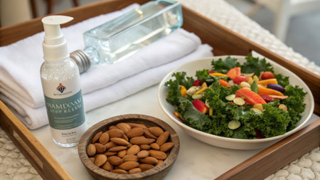 A variety of fresh ingredients and healthcare items are arranged on a gray surface, highlighting wellness themes.