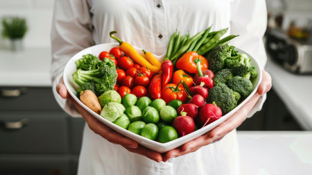 A nutritionist arranging a heart-shaped dish of vegetables, showcasing vibrant colors and variety.