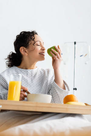 pleased african american woman enjoying flavor of ripe apple during breakfast in hospital