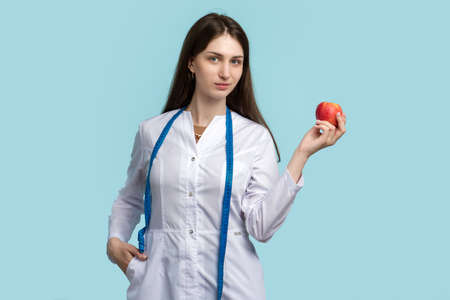Portrait Young Female Surgeon with Steel Surgical Instruments on blue background studio. Woman Doctor Medical Employee wears Medical Uniform White Coat. Healthcare Worker on Practice