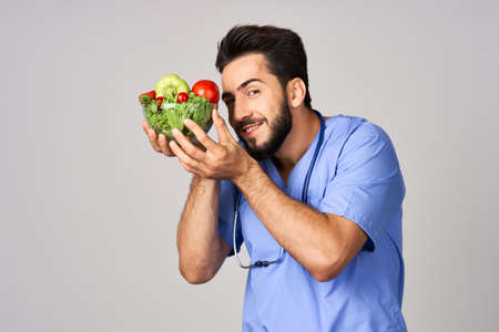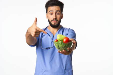birth bearded male doctor plate with vegetables healthy food treatment calories