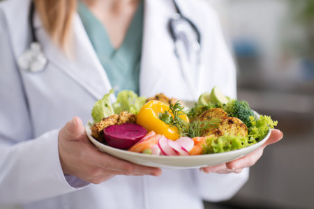 A nutrition expert presents a colorful plate filled with vibrant vegetables and grains in a modern clinic. The dish highlights healthy eating and nutrition education.