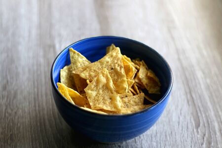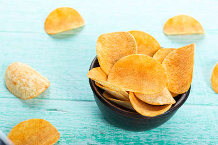 potato chips in an earthenware dish, plate stands on a blue wooden background. beer snack, unhealthy eating