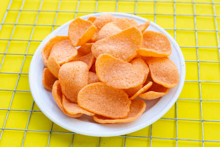Prawn crackers in white plate on yellow background. Shrimp crispy rice snack