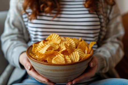 Pregnant woman sitting on the sofa enjoys eating potato chips from a bowl at home. ai generated