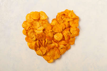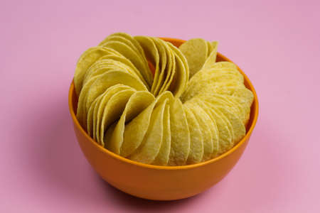 crisps Crispy potatoes. Potato chips on an orange background. Close up.