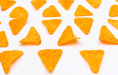 rows of Nachos on a white table. Mexican snack, corn tortilla chips.