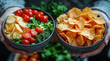 Woman holding a bowl of fresh salad and a bowl of tortilla chips, symbolizing healthy and unhealthy food choices