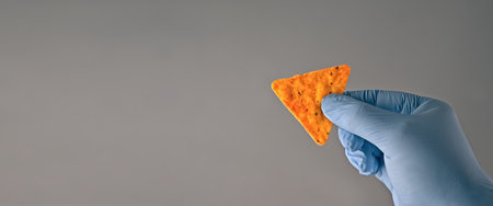 Gloved hand holding a hot tortilla chip for hot chip challenge. Panoramic image with copy space.