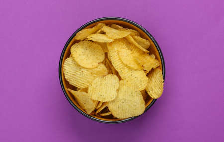 crisps Crispy potatoes. Potato chips on a pink background. Close up.