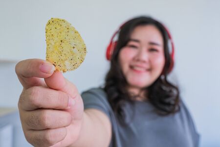 weightloss and slimming. crispy chips food temptation. body size and fitness. woman hands tied with measuring tape