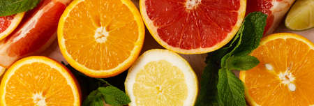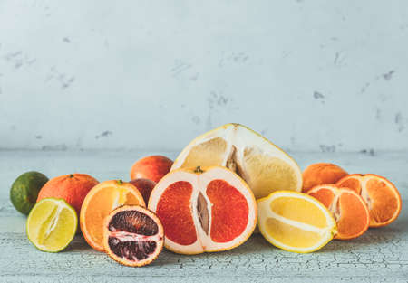Mix of different citrus fruits closeup. Healthy diet vitamin concept. Food photography