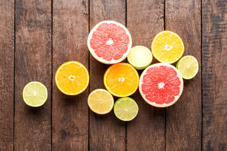 Variety of citrus fruit on the wooden background